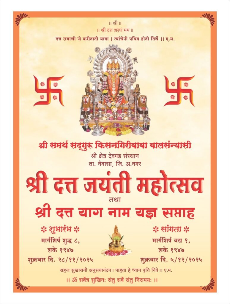 नेवासा, ता.१३ – श्रीगुरुदेव दत्तपीठ श्रीक्षेत्र देवगड संस्थान येथे शुक्रवार दि. २८ नोव्हेंबर ते ५ डिसेंबर या कालावधीत भगवान श्री दत्तप्रभूंचा जन्मोत्सव सोहळा मोठ्या उत्साहात साजरा करण्यात येणार आहे. सात दिवस चालणाऱ्या ग्रंथराज श्री ज्ञानेश्वरी पारायण आणि श्री दत्त याग सोहळ्याची तयारी अंतिम टप्प्यात आहे.