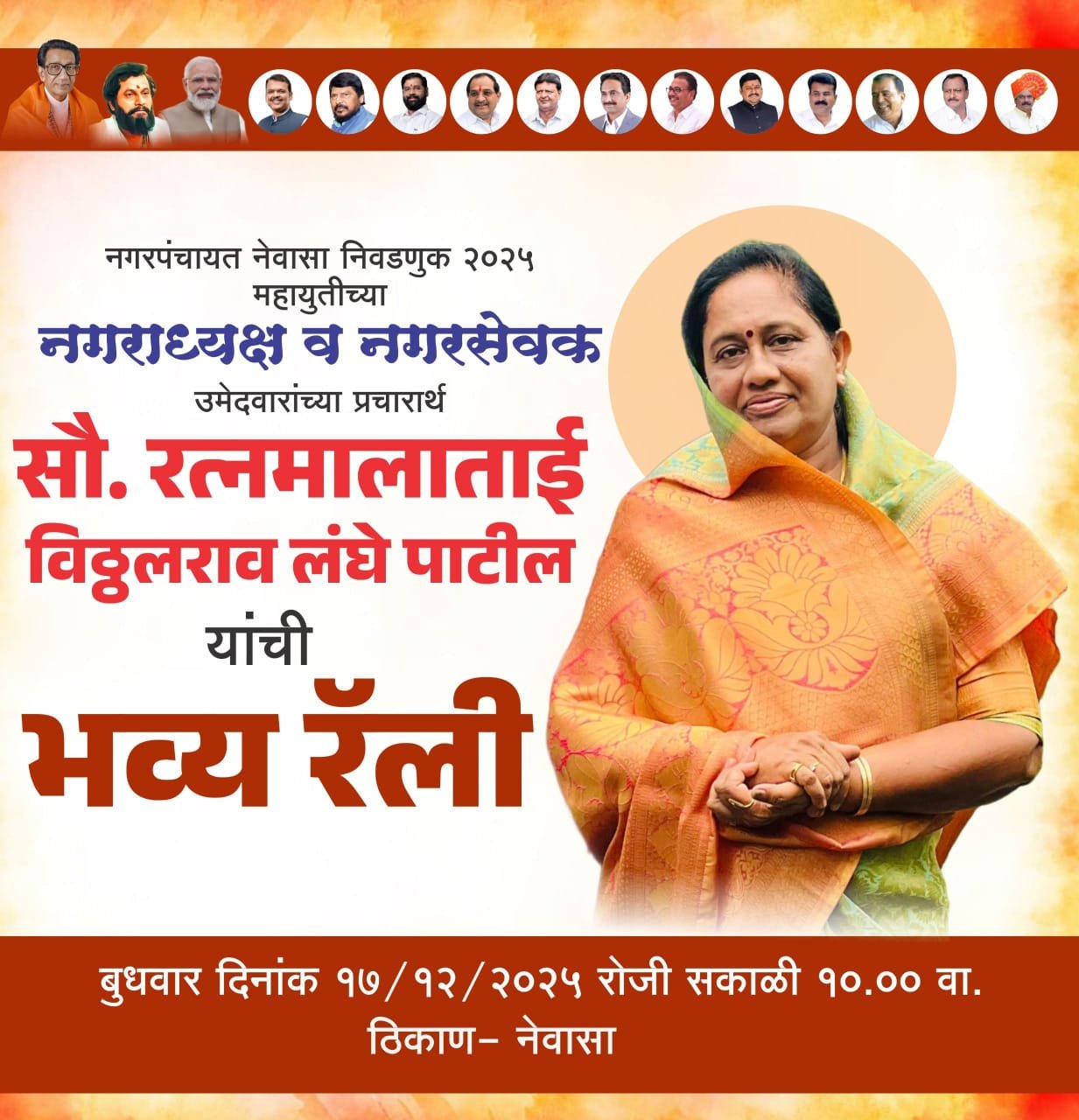 नेवासा : नेवासा नगरपंचायत निवडणूक २०२५ साठी प्रचाराचा जोर वाढवण्यात आला असून, नेवासा शहरात आज बुधवारी (दि. १७ डिसेंबर) भव्य प्रचार रॅलीचे आयोजन करण्यात आले आहे. महायुतीच्या उमेदवाराच्या प्रचारासाठी आमदार विठ्ठलराव लंघे यांच्या पत्नी सौ. रत्नमालाताई लंघे पाटील यांच्या नेतृत्वाखाली सकाळी १० वाजता नेवासा येथे महा रॅलीचे आयोजन होणार आहे.