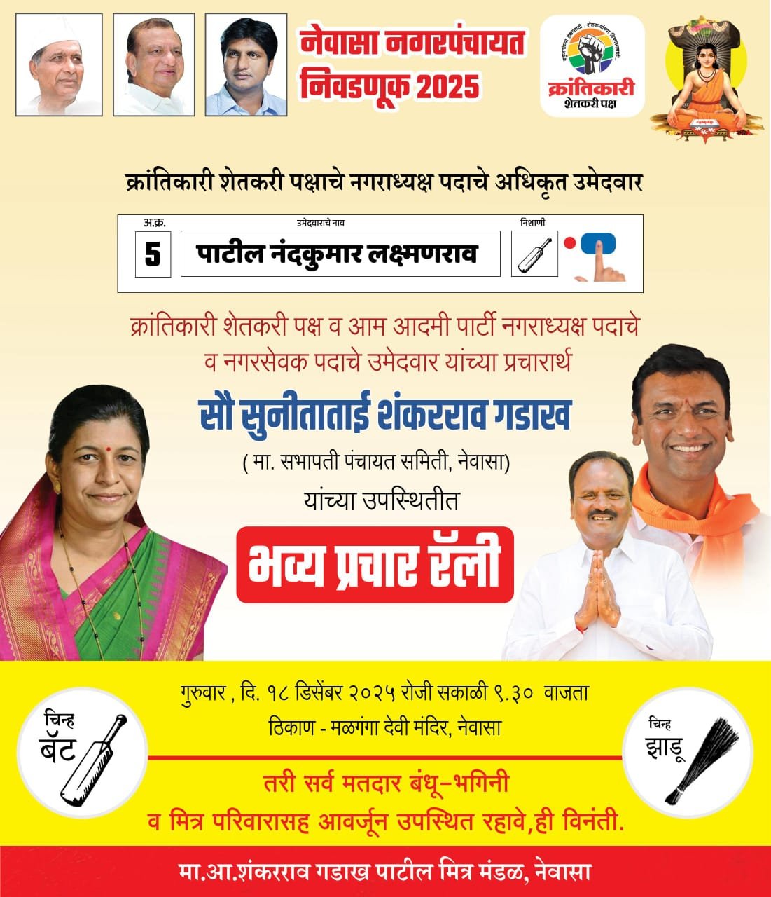 नगरपंचायत निवडणूक २०२५ मध्ये सत्ताधारी राजकारणाला थेट आव्हान देत क्रांतिकारी शेतकरी पक्ष व आम आदमी पार्टी रस्त्यावर उतरले आहेत. नगराध्यक्ष पदाचे अधिकृत उमेदवार पाटील नंदकुमार लक्ष्मणराव आणि क्रांतिकारी शेतकरी पक्षाच्या तसेच आम आदमी पार्टीचे उमेदवारांच्या प्रचारार्थ गुरुवार, दि. १८ डिसेंबर रोजी सकाळी ९.३० वाजता मळगंगा देवी मंदिर, नेवासा येथून जनतेचा संताप, शेतकऱ्यांचा आक्रोश आणि युवकांचा रोष व्यक्त करणारी भव्य प्रचार रॅली निघणार आहे.
