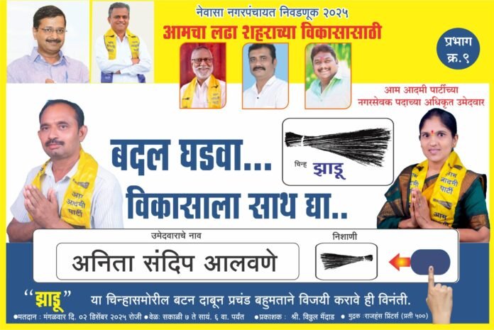 “ही लढत धनशक्ती विरुद्ध सर्वसामान्य जनतेची आहे. नागरिकांचा विश्वास आणि साथ मिळाल्यास नेवासा शहरात नियमित पाणीपुरवठा, स्वच्छतेची सुधारणा आणि तरुणांसाठी दर्जेदार मैदान उभारणे हे माझे पहिले काम असेल. प्रभाग नऊचा विकास नक्की घडवून आणेन,” असा निर्धार आलवणे यांनी व्यक्त केला.